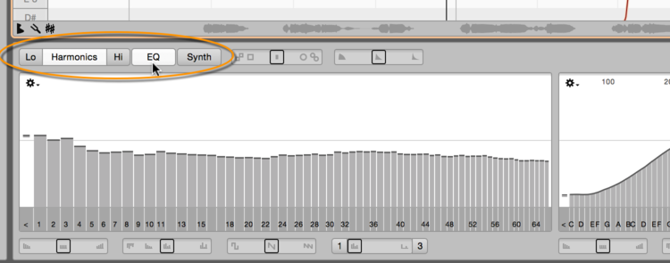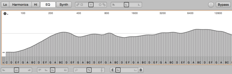 EQ作業エリアとその他のエリアの間で混乱を防ぐため、倍音ベースのもの、各帯域の現在のレベルは、水平の線ではなくカーブでここに表示されます。ただし、さまざまな周波数帯域のレベルの調整には、他のウィンドウでの倍音バーの高さの調整と同じテクニックが使用されるため、バーの選択とドラッグ方法を説明したセクションをまだお読みでない場合、まずそのセクションをご覧ください。