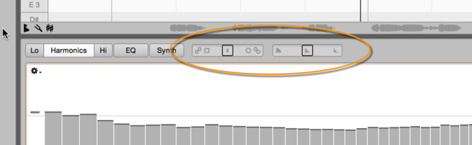 - 倍音または選択範囲の倍音を平均スペクトルの元のレベルに戻すには、該当のバーまたは選択範囲をCommand-クリックします。