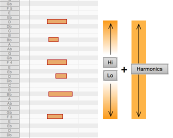 倍音、Lo、Hi: これらの作業エリアでは、ノートの上音構成を直接操作できます。それぞれレイアウトは同じで、全てのノートをコントロールする[倍音]が最も重要です。[Lo]と[Hi]は単に、希望に応じて、基音がトラックの音域の下半分(Lo)または上半分(Hi)にあるノートの倍音をさらに調整できます。