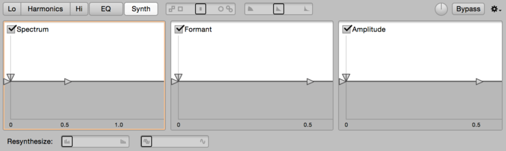 シンセ: この作業エリアには3つのエンベロープがあり、それぞれ、スペクトルに行った変更の各ノートの存続期間全体への影響、フォルマントの上向きまたは下向きのグライド、振幅内の内部変化を調整します。ここにも、サウンドエディターの再合成を調整する2つのグライダーがあります。
