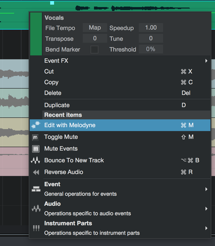 このような録音の一部を編集する場合、Melodyneで編集を開始する前に、該当のパッセージを新規イベントに変換しておくことをおすすめします([イベント]>[選択をバウンス])。短い新規オーディオファイルとなり、Melodyneの分析がずっと迅速になります。