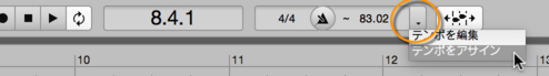 メニューから[オプション]>[テンポエディターを表示]>[テンポをアサイン]を選択するか、トランスポートバーのテンポフィールド右のドロップダウンメニューから[テンポをアサイン]を選択してテンポエディターを開きます。