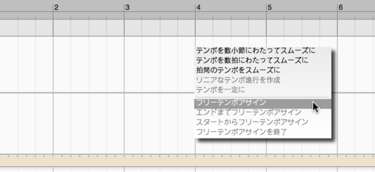テンポエディター内の該当するエリアを選択し、コンテキストメニューで[フリーテンポアサイン]を選択します。ファイル全体のテンポにフリーテンポをアサインしたい場合、このコマンドを使用する際に何も選択されていない状態にしておく必要があります。こうすることで、コマンドがテンポカーブ全体に作用します。
