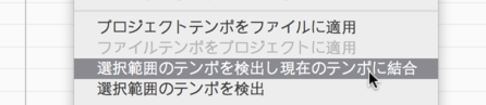 また、逆も可能です。たとえば、いくつかの関連録音からドラムトラックのテンポのみをアサインし、このアサインをプロジェクト全体のアサインに適用したいとします。この場合、[編集]>[テンポ]>[ファイルテンポをプロジェクトテンポに適用]コマンドが役立ちます。