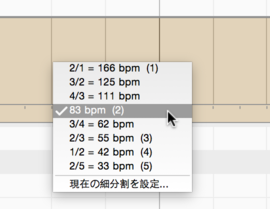 実際には8分音符の三連符であるのに、2つのサブ拍が4分音符に割り当てられてることもあります。この場合、2から3に分割を変更し、さらにテンポを3分の2に変更する必要があります。これらの変更は、リージョンのポップアップメニューを使用して行います。ここでは、4分音符に含まれるサブ拍の数を設定し、それに応じてテンポを変更できます。括弧内の数字は、検出されたサブ拍のうちいくつがテンポに組み込まれているかを示しています。この値は、サブ拍の倍数でない場合選択することもできます。