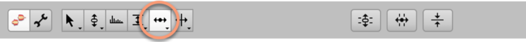 ノートエディターのツールボックスまたはコンテキストメニューから、またはコンピューターキーボードの5キーを押してタイムツールを選択します。5キーをすばやく2回または3回連続して押すと、タイムツールの1番目または2番目のサブツールを選択できます。(このツールに別のショートカットを割り当てたい場合、メインメニューの[Melodyne]>[環境設定]>[ショートカット]>[編集ツール]を選択して行えます。)ここでは、希望に応じて、3つ全てのツールに対して別のキーボードショートカットを定義することもできます。