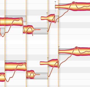 ただし、ノートがつながっている場合(メロディックアルゴリズムが選択されているとこうなることが多い)、blobの中央をクリック&ドラッグしても、伸縮するのはノートの先頭のみです。したがって、この場合の動作は、ノートの先頭をクリック&ドラッグした場合と同じです。