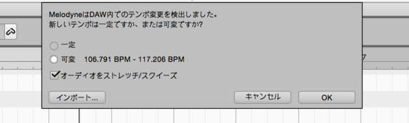 [OK]で設定内容を確定し、[キャンセル]で取り消します。Melodyneへとテンポ変更を転送するためにDAWをスタートしてから停止するまで、[OK]ボタンは灰色表示のままとなります。