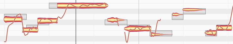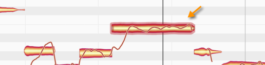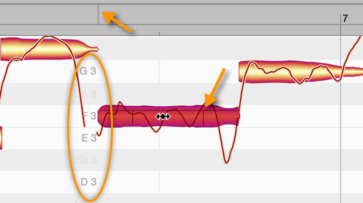 もっとも特筆するべき要素はローカルピッチルーラーです。マウスポインタをノート上に移動させると、ノートの前に表示されます。blobをドラッグしようとすると、blobの形をしたドラッグゾーンを示す細線が表示されます。